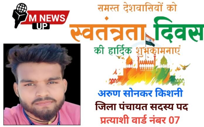 आप सभी देशवासियों प्रदेश वासियों और क्षेत्रवासियों को अरुण सोनकर किशनी भावी जिला पंचायत सदस्य प्रत्याशी वार्ड नंबर 07 की तरफ से स्वतंत्रता दिवस की हार्दिक बधाई एवं शुभकामनाएं