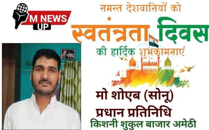 आप सभी देशवासियों प्रदेश वासियों और क्षेत्रवासियों को मो शोएब उर्फ सोनू प्रधान प्रतिनिधि ग्राम पंचायत किशनी विकास क्षेत्र शुकुल बाजार जनपद अमेठी की तरफ से स्वतंत्रता दिवस 2025 की हार्दिक बधाई एवं शुभकामनाएं