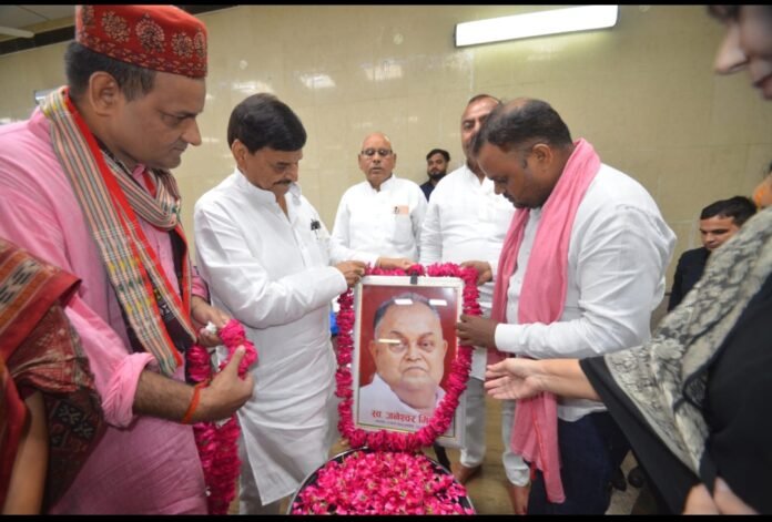 लखनऊ समाजवादी के नेता जनेश्वर मिश्र की पुण्यतिथि शिवपाल सिंह यादव के सरकारी आवास कार्यालय पर आयोजित किया गया साड़ी वितरण समारोह कार्यक्रम की शुरुआत जनेश्वर मिश्र की मूर्ति पर पुष्पांजलि कर कार्यक्रम शुरुआत की गई कार्यक्रम की अध्यक्षता दीपक मिश्रा द्वारा की गई साड़ी वितरण समारोह किन्नर सभा की प्रदेश अध्यक्ष पायल द्वारा आयोजित किया गया साड़ी वितरण समारोह में डेढ़ सौ महिलाएं उपस्थित रही कार्यक्रम मे मुख्य अतिथि शिवपाल सिंह यादव राष्ट्रीय महासचिव द्वारा साड़ी वितरण समारोह किया गया कार्यक्रम में पूर्व मंत्री शादाब फातिमा संगीता यादव रंजीत यादव खलीफा हरिशंकर यादव कार्यालय प्रभारी अरविंद यादव अधिवक्ता सभा के पूर्व प्रदेश अध्यक्ष अजीत सिंह चौहान सहित मंच पर विशिष्ट जन मौजूद रहे शिवपाल सिंह यादव ने अपने भाषण में जनेश्वर मिश्र के बेगम हजरत महल पार्क के द्वारा दिए गए धरना में नेताजी की अविस्मरणीय भूमिका के बारे में बताया बलिया जिला कार्यालय में हुए धरने की चर्चा करते हुए जनेश्वर जी के कई संस्मरण साझा किया नेताजी का भाषण के मुख्य अंश दवा पढ़ाई मुफ्ती हो रोटी कपड़ा सस्ती हो मैं अपने भाषण को संबोधित किया कार्यक्रम में प्रदेश अध्यक्ष किन्नर सभा पायल ने शिवपाल सिंह यादव राष्ट्रीय महासचिव समाजवादी पार्टी का बड़ी माला पहनकर स्वागत किया