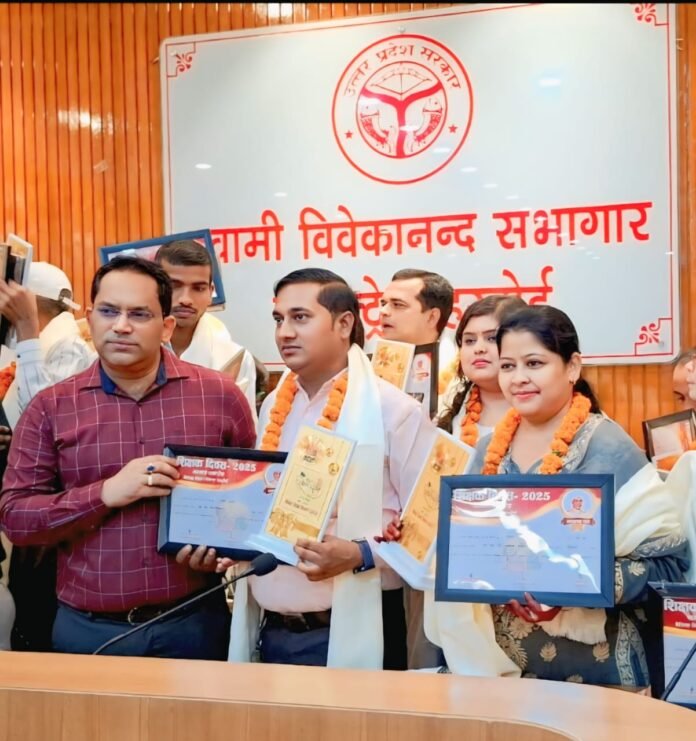 हरदोई।स्वामी विवेकानंद सभागार कलेक्ट्रेट में शिक्षक सम्मान समारोह का आयोजन किया गया। इस अवसर पर समस्त जनपद से उत्कृष्ट कार्य करने वाले शिक्षकों को जिलाधिकारी मुख्य विकास अधिकारी डायट प्राचार्य तथा जिला बेसिक शिक्षा अधिकारी द्वारा सम्मानित किया गया। इस कड़ी में ब्लॉक कोथावां के प्राथमिक विद्यालय थानगांव में कार्यरत शिक्षक डॉ राजीव कुमार को स्मृति चिन्ह अंग वस्त्र और प्रशस्ति पत्र देकर सम्मानित किया गया। जिलाधिकारी ने अपने उद्बोधन में कहा कि पूरे जनपद से शिक्षा नवाचार में उत्कृष्ट कार्य करने वाले शिक्षकों को आज यहां सम्मानित करते हुए हर्ष हो रहा है उम्मीद है की अगले वर्ष इसकी दोगुनी संख्या में शिक्षकों को सम्मानित किया जाए सभी शिक्षक अच्छा कार्य करें। सम्मान समारोह में जिलाधिकारी अनुनय झा, मुख्य विकास अधिकारी सान्या छाबड़ा, डायट प्राचार्य योगेंद्र सिंह, जिला बेसिक शिक्षा अधिकारी विजय प्रताप सिंह, एसआरजी आशीष मिश्रा समेत सैकड़ो संख्या में शिक्षक शिक्षिकाएं प्रधान अभिभावक उपस्थित रहे।