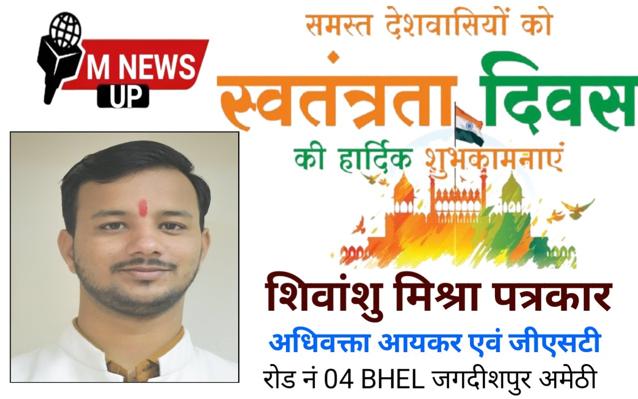 आप सभी देशवासियों प्रदेश वासियों और क्षेत्रवासियों को शिवांशु मिश्रा पत्रकार/ अधिवक्ता आयकर एवं जीएसटी ऑफिस रोड नं 04 BHEL जगदीशपुर अमेठी की तरफ से स्वतंत्रता दिवस 2025 की हार्दिक बधाई एवं शुभकामनाएं।