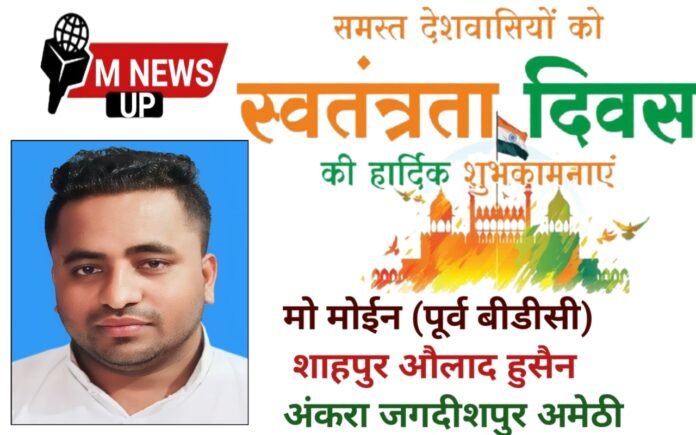 आप सभी देशवासियों प्रदेश वासियों और क्षेत्रवासियों को मो मोईन पूर्व बीडीसी शाहपुर औलाद हुसैन ग्राम सभा अंकरा जगदीशपुर अमेठी की तरफ से स्वतंत्रता दिवस 2025 की हार्दिक बधाई एवं शुभकामनाएं